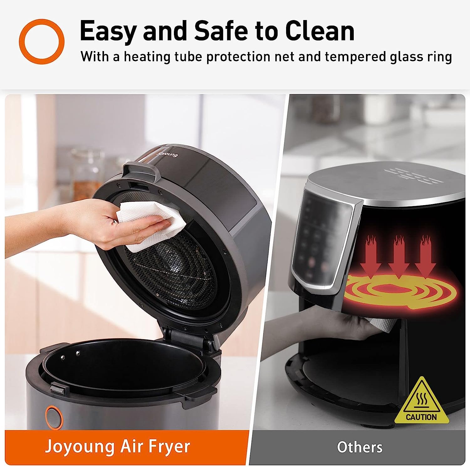 En comparación con otra freidora, la freidora de aire de la serie de lentes Joyoung tiene un ángulo de apertura de tapa más grande con una red de protección del tubo de calentamiento y un anillo de vidrio templado, lo que le permite limpiar fácilmente toda la freidora para una vida útil más larga.
